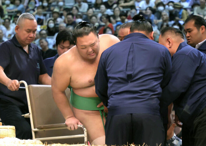 元大関の朝乃山ですが名古屋場所四日目の17日、平幕の一山本に「押し倒し」で敗れた際に左ひざなどを痛め五日目から休場しています。