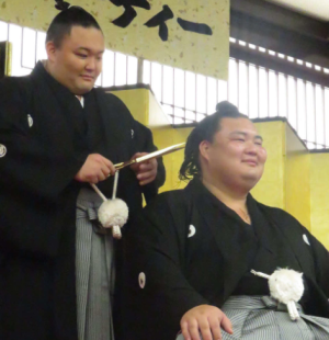 引退した兄弟子・朝弁慶の断髪式で。