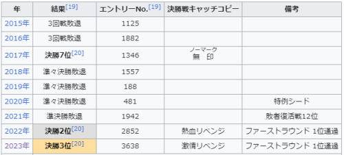 ところで、上のWikipediaの表で今年(2024年)の欄ですが、不参加になっています。